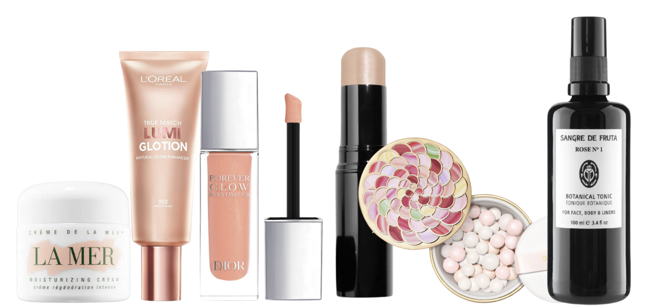 Moisturizer, La Mer. Tinted lotion, L'Oréal. Liquid highlighter, Dior. Highlighter stick, Chanel. Illuminating powder, Guerlain. Rose essence, Sangre de Fruta.